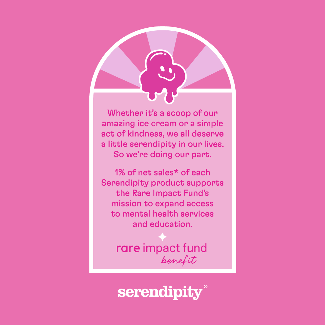 Whether it’s a scoop of our amazing ice cream or a simple act of kindness, we all deserve a little serendipity in our lives. So we’re doing our part. 1% of net sales* of each Serendipity product supports the Rare Impact Fund’s mission to expand access to mental health services and education. *purchase price minus trade promotion costs, through December 2027.